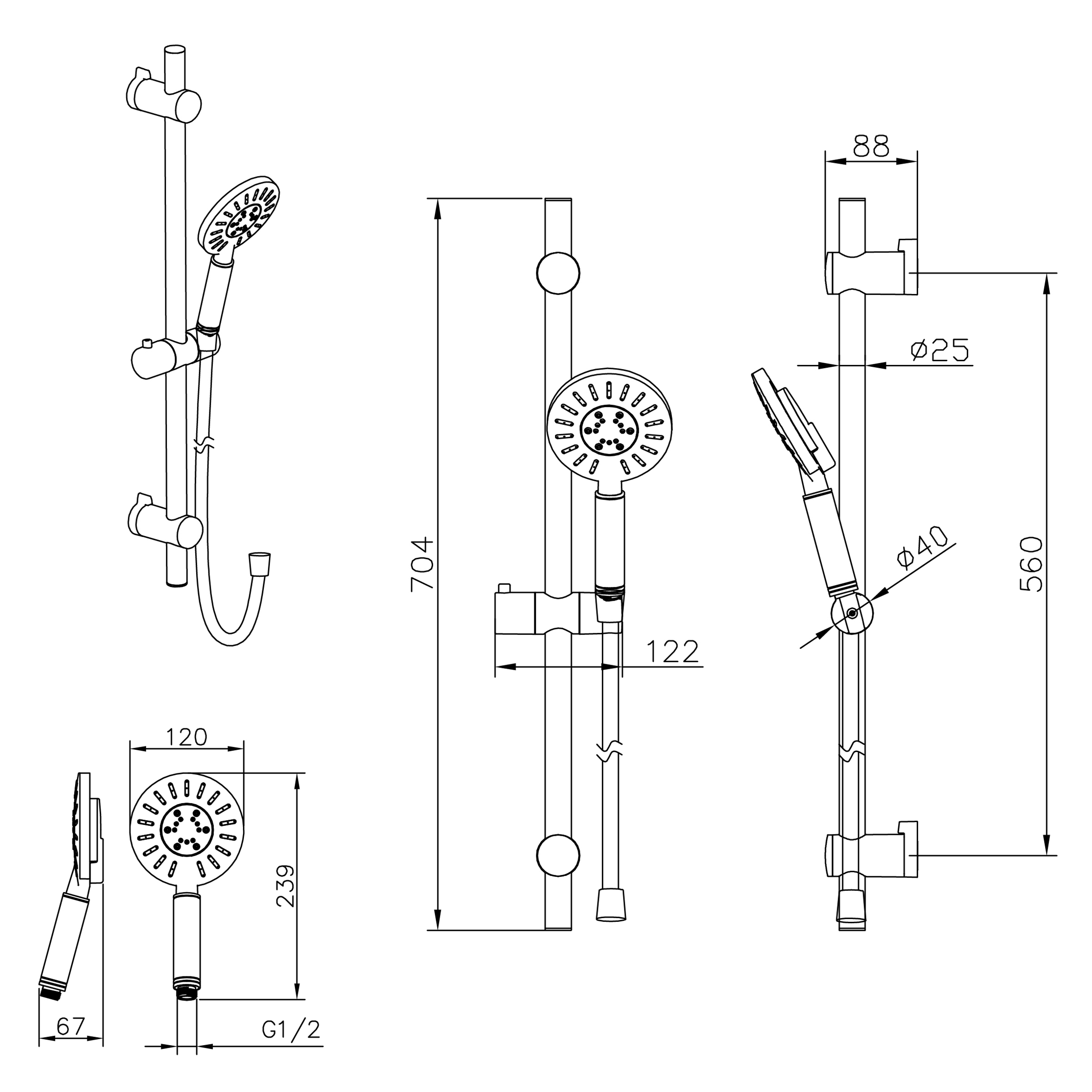 - The shower set consists of a hand shower, shower riser rail, hose, shower head holder and fastening material