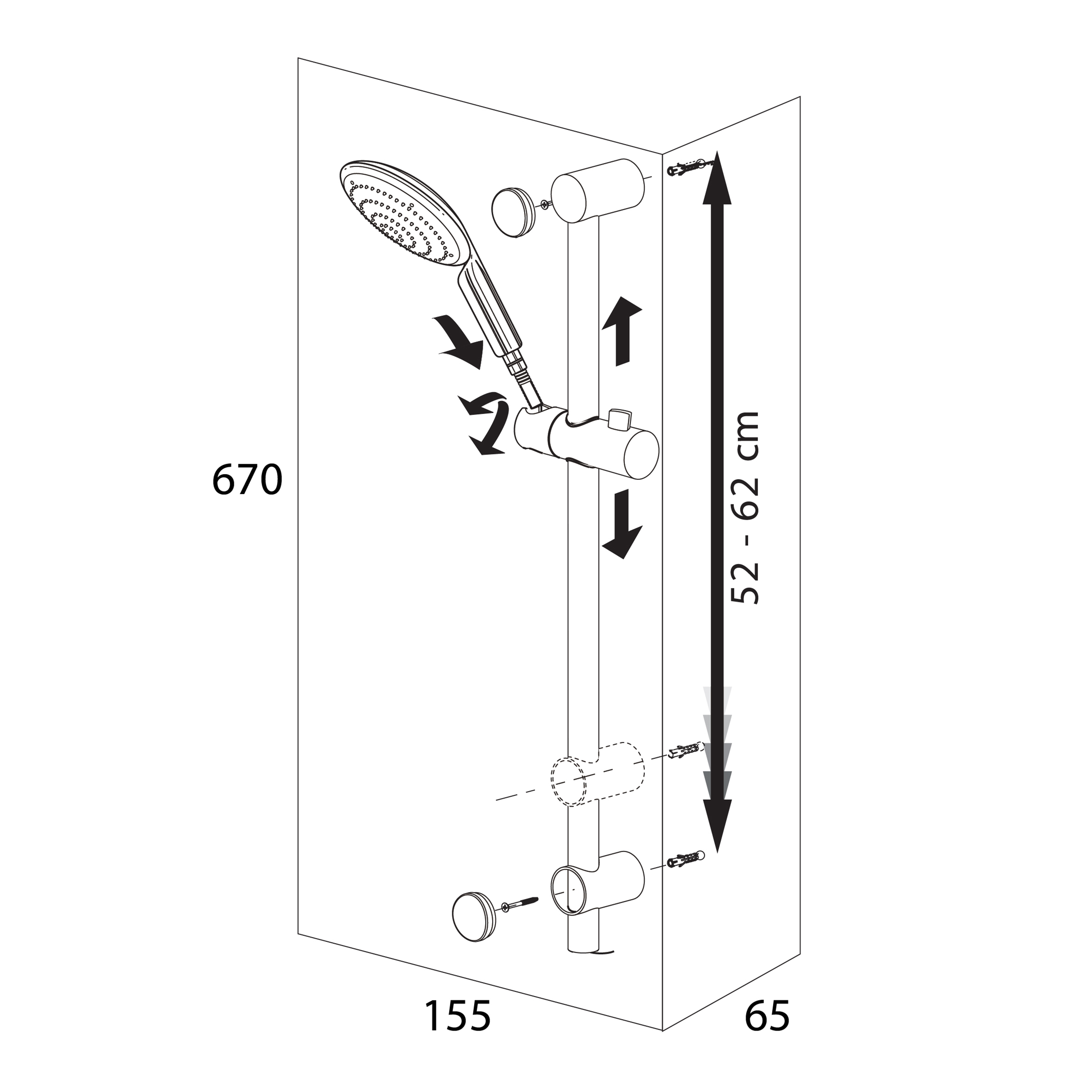 • Instelbare douchestang kan op bestaande boorgaten gebruikt worden (52 - 62 cm)